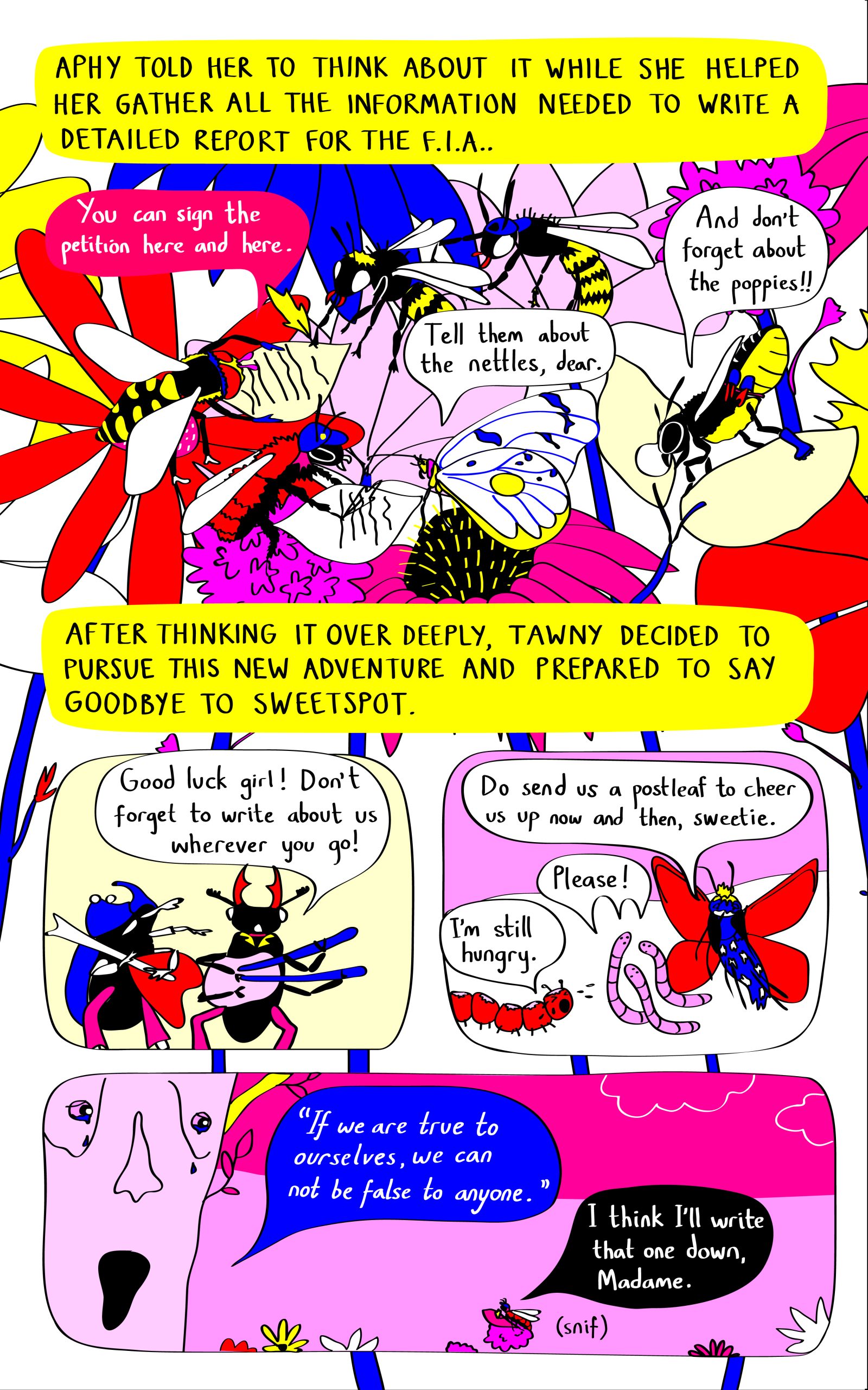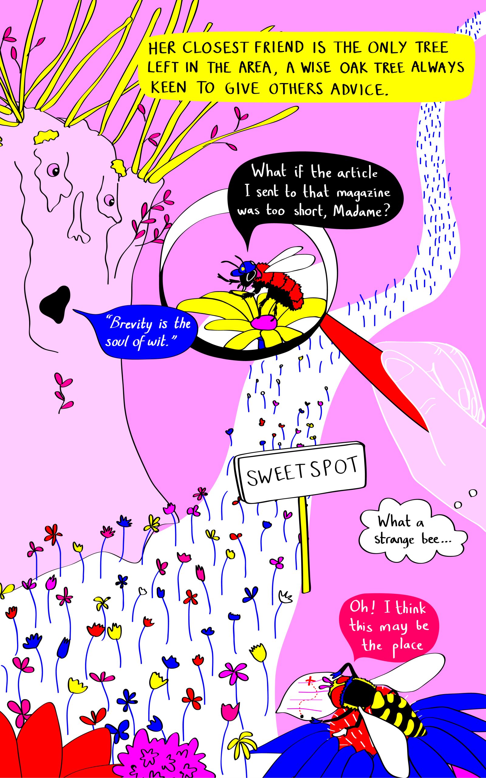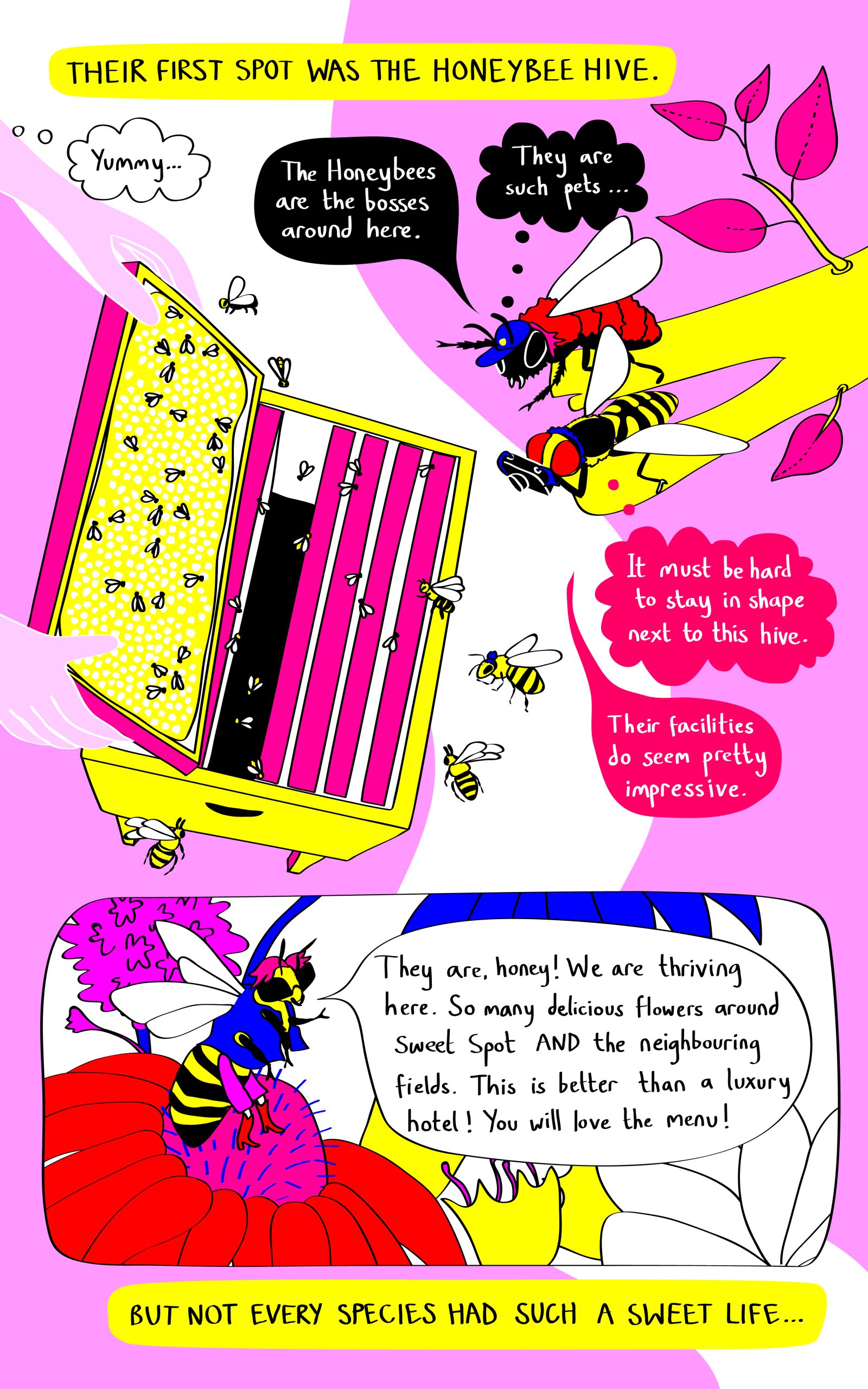 HONEYBEE: They are, honey! We are thriving here. So many delicious flowers around Sweet-spot AND the neighbouring fields! This is better than a luxury hotel. You will love the menu!