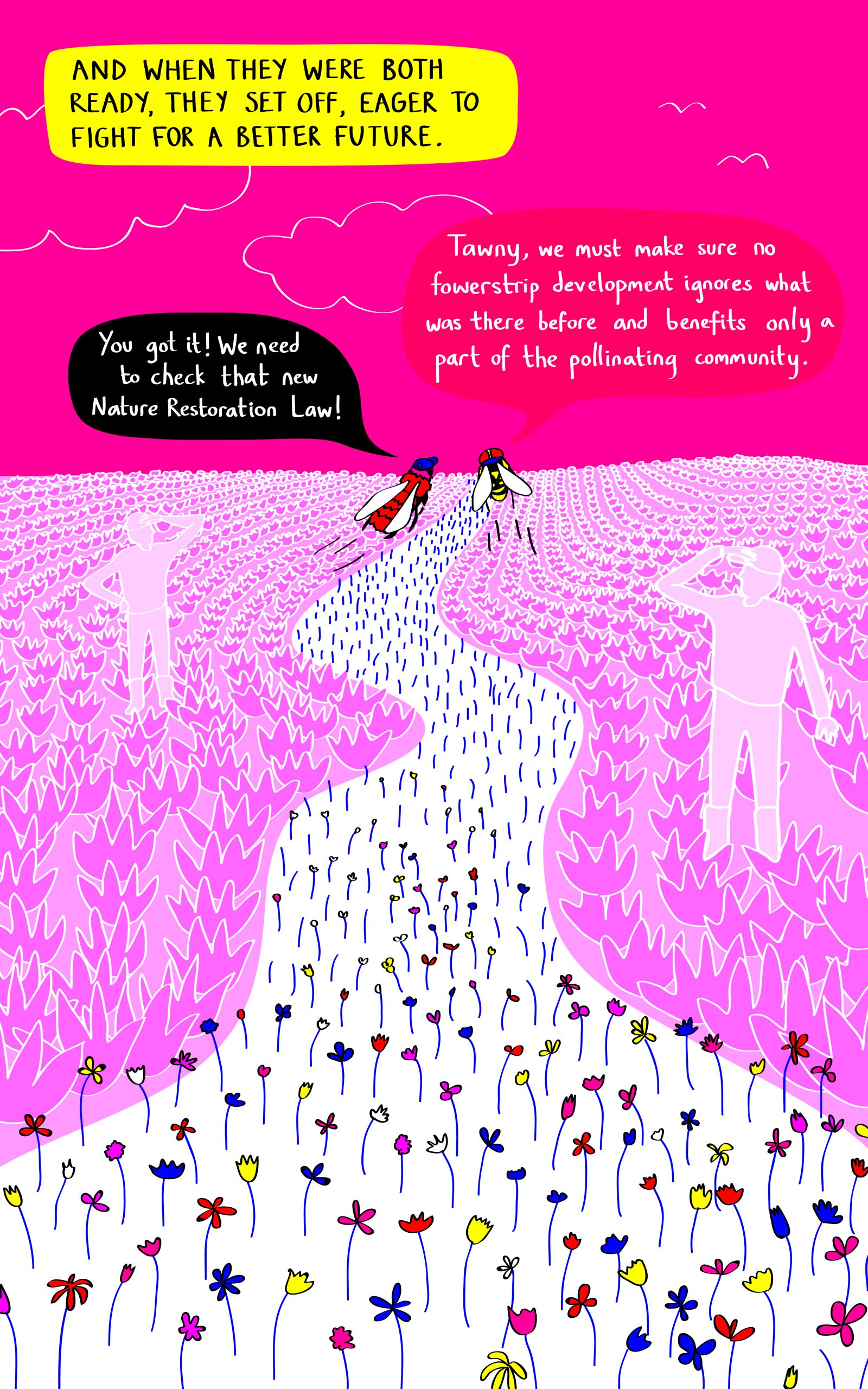 To Bee or Not to Bee explores the promise—and sometimes pitfalls—of Nature-based Solutions like flower strips. While designed to support pollinators and boost crop production, such interventions can unintentionally favour a few species while overlooking the needs of other species, including nesting and habitat requirements, and local ecological history. Through Tawny’s journey, the comic highlights the importance of biodiversity, inclusive design, and careful planning. Nature-based solutions work best when they restore whole ecosystems, not just visible benefits. It’s a timely reminder, too, as Europe moves forward with implementing its Nature Restoration Regulation.