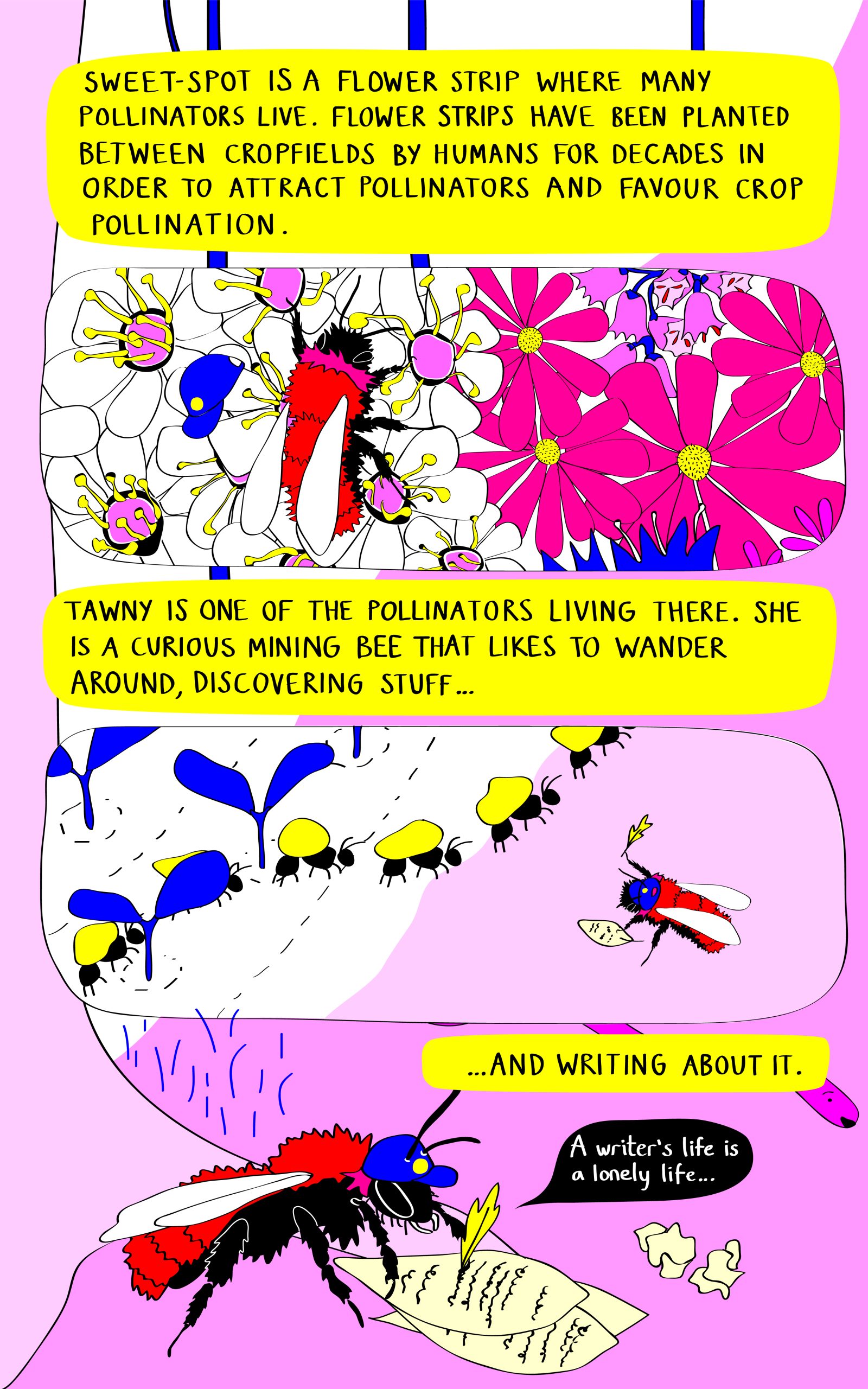 TAWNY IS ONE OF THE POLLINATORS LIVING THERE. SHE IS A CURIOUS MINING BEE THAT LIKES TO WANDER AROUND, DISCOVERING STUFF…